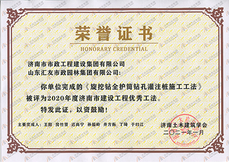 • 2020年度济南市建设德扑之星优异工法《旋挖钻全护筒钻孔灌注桩施工工法》